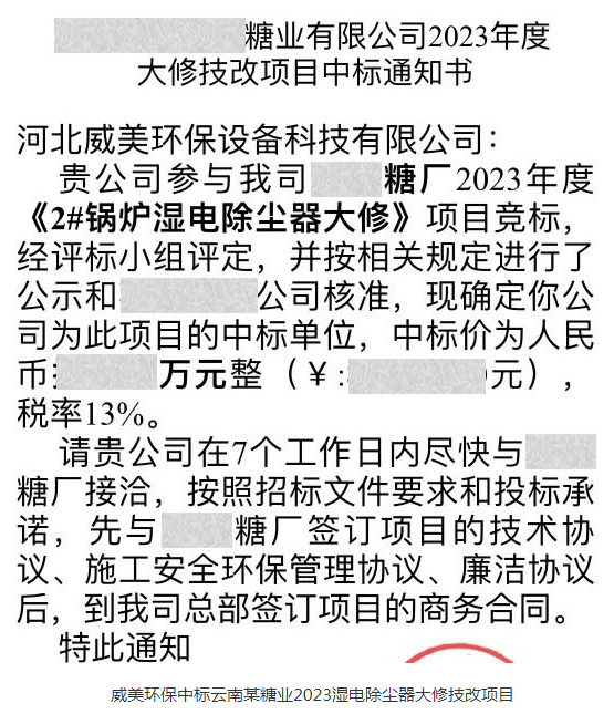 近日,威美環(huán)保中標(biāo)云南某糖業(yè)2023年度濕電除霧器大修技改項(xiàng)目。