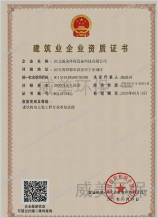 建筑業(yè)的企業(yè)資質(zhì)證書是企業(yè)資產(chǎn),是對威美人才力量與作業(yè)能力的肯定。河北威美環(huán)保設(shè)備是一家集設(shè)計、制造、安裝、調(diào)試濕電除霧器、脫硫設(shè)備于一體的高新型技術(shù)企業(yè)。河北威美環(huán)保堅持在尾氣治理設(shè)備制造領(lǐng)域中不斷創(chuàng)新發(fā)展,目前已有百余臺設(shè)備運行在燃煤鍋爐、金屬冶煉、氰尿酸、磷化工、生物質(zhì)(糖廠/糠醛)鍋爐、高性能纖維、垃圾焚燒等領(lǐng)域。我們通過電話溝通,實地考察測量,為您的生產(chǎn)線量身定制尾氣治理方案。威美環(huán)保將持續(xù)深耕于煙氣治理設(shè)備制造領(lǐng)域,進(jìn)一步加大技術(shù)的開發(fā)和創(chuàng)新力度,并不斷增強自身的核心競爭力,推動高質(zhì)量的發(fā)展。