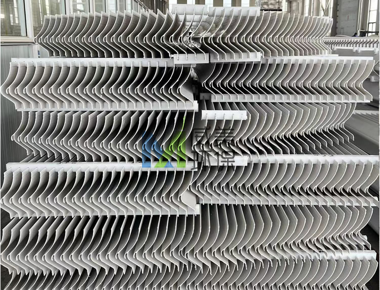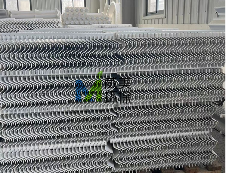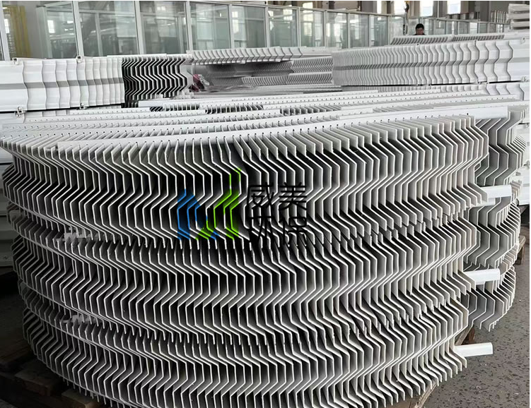 平板式除霧器適用于中、低氣速的吸收塔,主要用于氣體和流體的分離,一般被裝在吸收塔的頂部,可以很好去除3-5μm的霧滴,其分離出來的液滴直接落入吸收塔內的漿液池中。根據性能要求,平板式除霧器可以用于一層或者多層系統(tǒng),并且可以加裝在線沖洗系統(tǒng),另外平板式除霧器也可以配合濕電靜電除霧器、管束除塵除霧器等設備使用。
