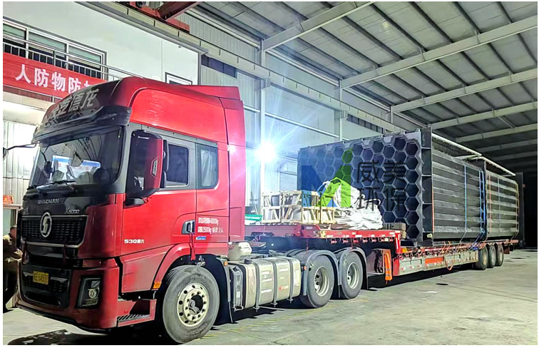 兩臺濕電除霧器處理氣量均為250000m³/h,煙氣溫度低于85℃,除霧器進出風口布置為下進上出,該設備建成后,單臺設備鋼架走梯平臺重量約為98T,設備內部件及絕緣系統(tǒng)等重量約為102T,單臺設備總重量約200T(不含進出口煙道)。以下是建成設備現(xiàn)場,目前已投入使用: