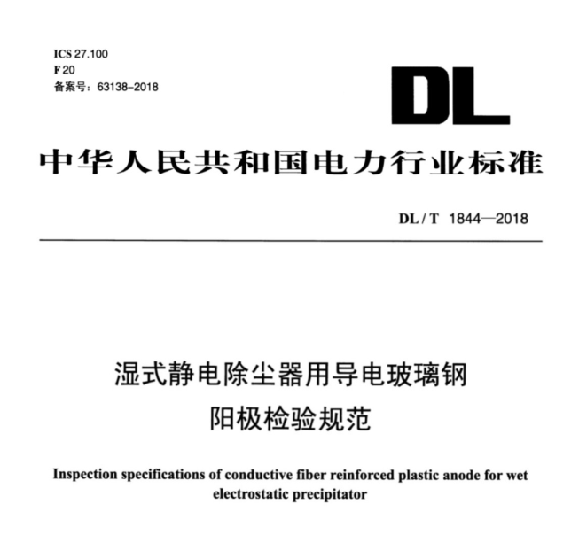 濕式靜電除霧器用導(dǎo)電玻璃鋼陽極檢驗(yàn)規(guī)范 DL/T 1844-2018于2018年4月3日國(guó)家能源局發(fā)布,2018年7月1日實(shí)施。